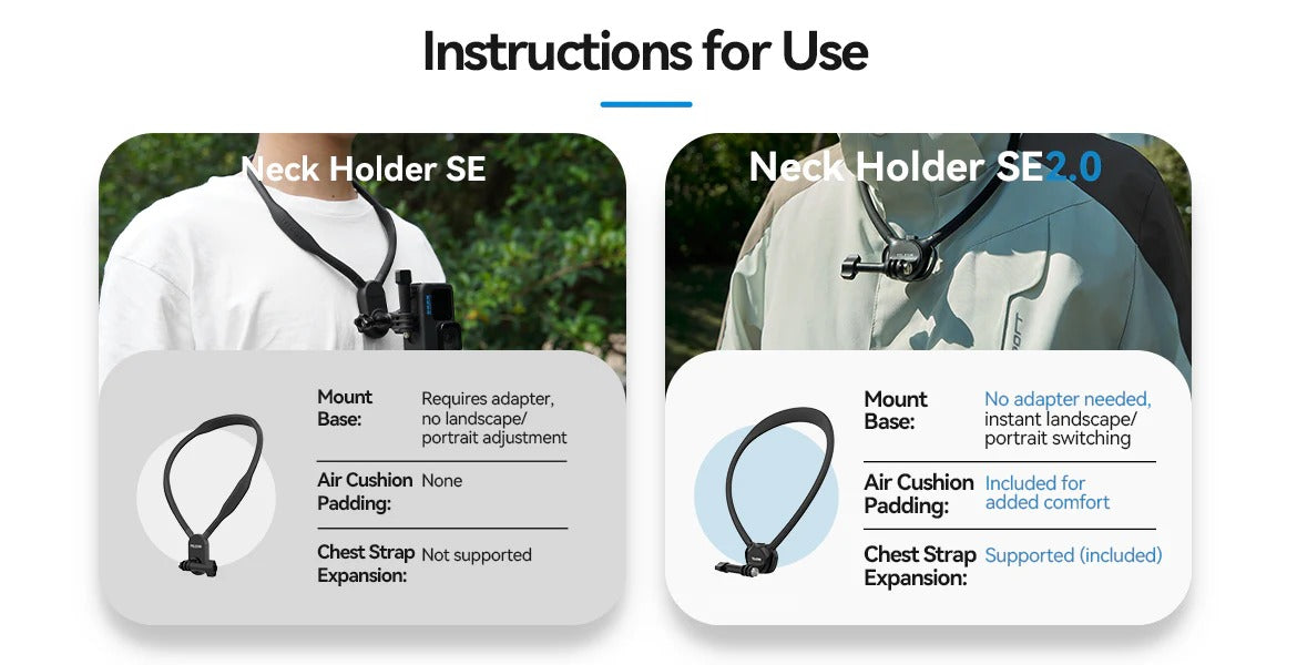 Se você já possui vários suportes para câmera (capacete, guidão ou tripé), o Neck Holder SE 2.0 se torna sua opção dedicada para filmagens em primeira pessoa junto ao corpo, adicionando mais um ângulo ao seu equipamento atual.